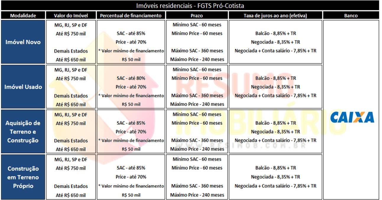 Home Condições de Financiamento Resumo Imobiliário divulga as condições atuais de financiamento do FGTS Pró-Cotista na Caixa